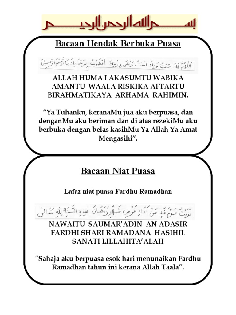 Berikut dikongsikan niat puasa Ramadhan dalam rumi dan doa berbuka puasa. Syeikh Muhammad bin Salih al-Utsaimin menjelaskan bahawa keadaan seorang muslim yang belum berbuka puasa pada waktu puncak menunggu azan Maghrib adalah situasi di mana keadaan hamba itu lemah dan mampu berdoa sepenuh hati kepadaNya. Niat puasa ganti puasa qada dalam rumi.